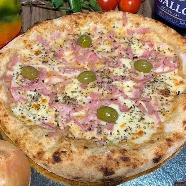 Molho de tomate, muçarela, presunto ralado, azeitona e orégano.